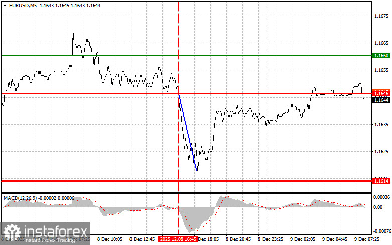 اختبار السعر عند 1.1646 تزامن مع بدء مؤشر MACD في التحرك للأسفل من خط الصفر، مما أكد نقطة الدخول الصحيحة لبيع اليورو. ونتيجة لذلك، انخفض الزوج بحوالي 30 نقطة.