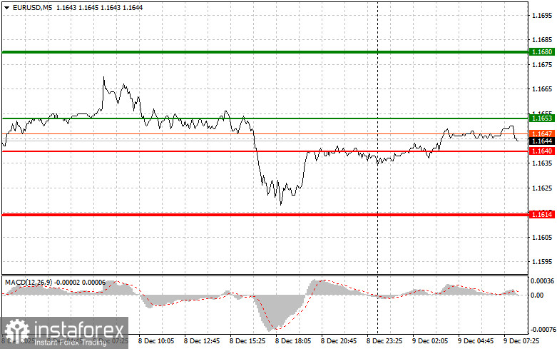 السيناريو 1: أخطط لبيع اليورو بمجرد أن يصل إلى 1.1640 (الخط الأحمر على الرسم البياني). سيكون الهدف 1.1614، حيث أنوي الخروج من السوق والشراء مرة أخرى فورًا (متوقعًا حركة تتراوح بين 20-25 نقطة في الاتجاه المعاكس). سيعود الضغط على الزوج مع البيانات الضعيفة. مهم! قبل البيع، تأكد من أن مؤشر MACD تحت علامة الصفر ويبدأ في الانخفاض منها.