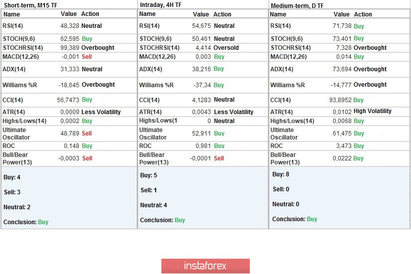 Analyzing different sectors of time frames (TF), we see that the indicators of technical instruments on the minute, hourly and daily timeframes signal a buy due to price fluctuations at the conditional maximum.