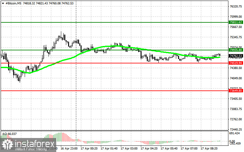 Scenario #2: Bitcoin can be bought from the lower boundary of $74,500 if there is no market reaction to its breakout in the opposite direction to levels $75,000 and $75,800.