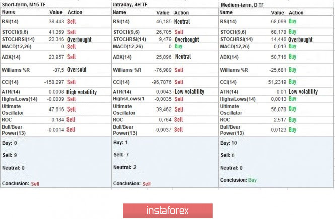 Analyzing the different sectors of time frames (TF), we can see that the indicators of technical instruments in the minute and hourly periods signal "sell" due to the quote nearing the price level of 1.3000. Meanwhile the daily period, as before, signals "Buy", due to the general movement, but if the quote consolidates below 1.2950, everything may change.