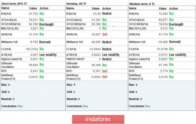 Analyzing the different sectors of time frames (TF), we can see that the indicators of technical instruments on the minute and hourly periods currently signal "buy", but it may change soon due to the price fluctuation within the price range 1.3060 / 1.3100. Meanwhile the daily period, as before, signals "buy" due to the general trend, but if the price falls below the level of 1.2950, this may change as well.