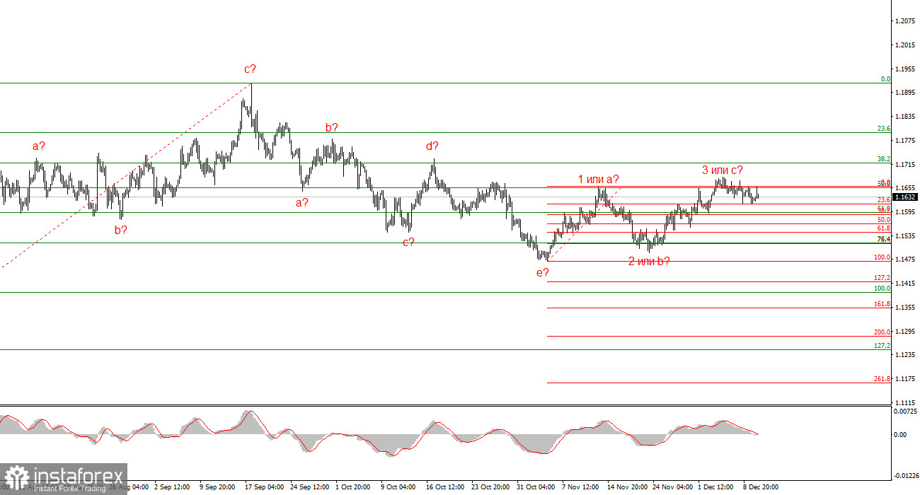 На мой взгляд, построение повышательного участка тренда не завершено, а его цели разбросаны вплоть до 25-й фигуры. Серия волн a-b-c-d-e выглядит завершенно, следовательно, я в ближайшие недели ожидаю построения нового повышательного набора волн. Мы увидели предполагаемые волны 1 и 2, а сейчас инструмент находится в стадии построения волны 3 или с. Я ожидаю, что в рамках этой волны инструмент повысится до отметки 1,1717, что приравнивается к 38,2% по Фибоначчи, однако третья волна формально может быть завершена в любой момент, так как превысила пик первой волны.