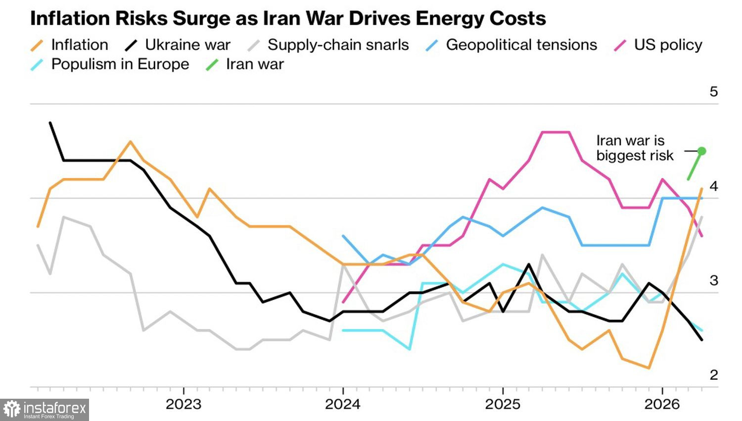 От геополитики к инфляции. Рынки начинают менять свои взгляды на конфликт на Ближнем Востоке. Если первоначально был шок, то спустя семь недель их больше интересуют последствия. Эксперты Bloomberg указывают разгон потребительских цен в еврозоне и нарушение цепочек поставок в качестве самых больших рисков для экономики валютного блока, в то время как геополитика осталась на втором месте. Это обстоятельство оказывает давление на EUR/USD.