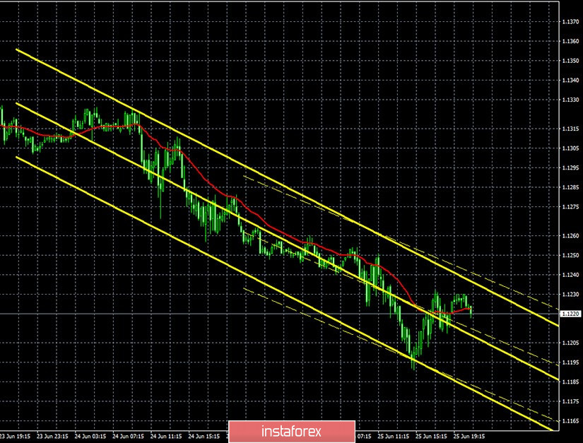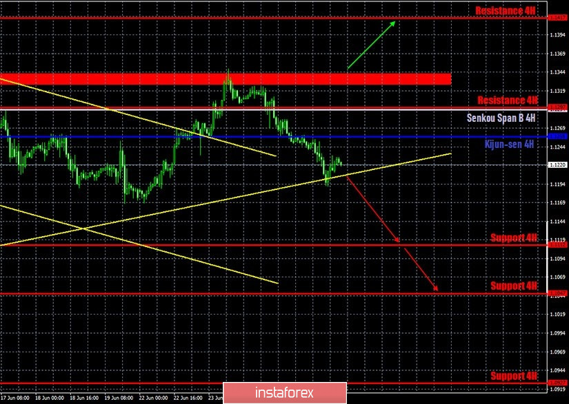 Trader terus mundur dari area resistance 1.1328-1.1343 pada timeframe per jam pada 25 Juni dan menyusun garis tren naik pada akhir hari perdagangan, yang terus mendukung para trader untuk naik. Upaya pertama untuk melampaui garis tren tidak berhasil, jadi untuk sekarang, bull mempertahankan peluang untuk kembali memulai tren naik. Namun, kami percaya bahwa penjual memiliki peluang yang lebih baik sekarang, oleh karena itu, kami menunggu garis tren untuk dilampaui dan euro terus jatuh. Perlu juga dicatat bahwa pasangan ini melampaui garis penting Senkou Span B dan Kijun-sen indikator Ichimoku dalam perjalanan ke garis tren, yang juga meningkatkan kemungkinan kelanjutan penurunan.