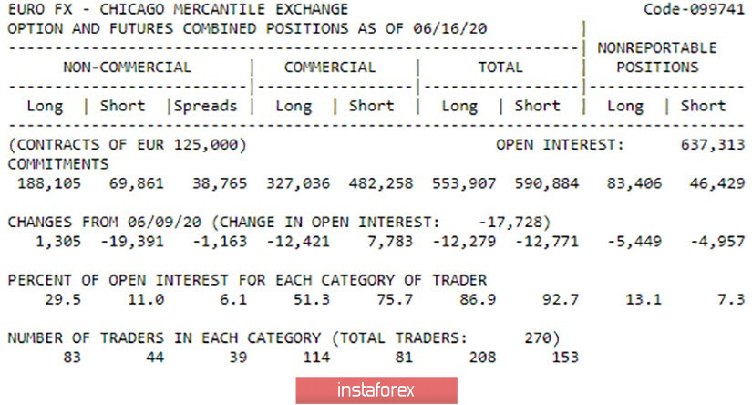 Pasangan euro/dolar terus naik hingga 16 Juni (batas waktu, data yang termasuk dalam laporan COT terbaru) dan hanya disesuaikan dalam beberapa hari terakhir. Menurut laporan COT, trader profesional sibuk selama sepanjang minggu pelaporan bukan dengan pembukaan kontrak pembelian, yang dapat diasumsikan berdasarkan arah pergerakan pasangan, tetapi dengan penutupan kontrak penjualan. Hanya dalam lima hari, trader profesional menutup hampir 20.000 kontrak Jual dan membuka 1.300 kontrak Long Euro pada saat yang sama. Dengan demikian, penguatan mata uang Eropa sangat logis saat itu. Tetapi selama dua minggu berturut-turut, kami menekankan bahwa pelaku pasar besar tidak membeli euro, dan karena itu tidak percaya pada prospek mata uang ini. Euro tumbuh selama dua minggu hampir pada penutupan kontrak belaka untuk dijual oleh spekulan besar, yang menyebabkan miringnya penawaran dan permintaan terhadap euro. Pasangan ini naik sekitar 170 poin sejak Senin, setelah turun hampir sama banyaknya, sehingga sulit untuk mengatakan bagaimana suasana hati para trader profesional telah berubah selama minggu ini. Kemungkinan besar, kami tidak akan melihat perubahan besar dalam laporan COT yang baru.