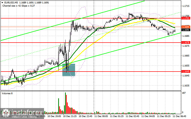 Semalam, beberapa titik kemasukan ke dalam pasaran telah terbentuk. Mari kita lihat carta 5 minit dan menganalisis apakah yang berlaku di sana. Dalam ramalan pagi saya, saya memberi tumpuan kepada tahap 1.1649 dan merancang untuk membuat keputusan kemasukan pasaran dari tahap tersebut. Peningkatan dan pembentukan penembusan palsu sekitar 1.1649 memberikan peluang menjual euro, menghasilkan penurunan kecil 20-pip dalam pasangan ini. Pada separuh kedua hari itu, satu lagi penembusan palsu sekitar 1.1649 memberikan peluang membeli euro, yang menyebabkan pasangan ini meningkat ke arah tahap sasaran 1.1703.