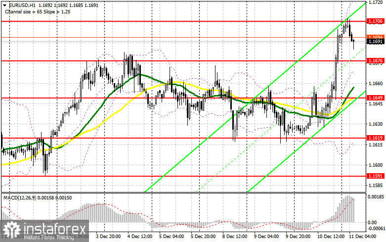 Semalam, Jawatankuasa Pasaran Terbuka Persekutuan mengundi 9 kepada 3 untuk menurunkan kadar faedah utama sebanyak 0.25% kepada julat sasaran 3.5% hingga 3.75%. Ini menyebabkan kelemahan pada dolar dan penguatan pada euro. Selain itu, Rizab Persekutuan mengumumkan bahawa mereka akan mula membeli bon Perbendaharaan jangka pendek bermula 12 Disember, secara efektif menghidupkan semula mesin cetak. Walaupun skala pembelian ini belum setanding dengan QE klasik, tindakan Fed adalah bertujuan untuk menyokong ekonomi. Bagi hari ini, hanya kadar pengangguran suku tahunan di Itali dan mesyuarat Eurogroup yang dijangka. Acara-acara ini tidak mungkin memberi kesan negatif kepada euro. Namun, jika pasangan mata wang ini menurun, saya menjangka tanda-tanda awal pembeli sekitar paras sokongan 1.1676. Saya merancang untuk membeli di sana hanya selepas pembentukan penembusan palsu, yang akan memberikan titik masuk untuk kedudukan panjang dengan matlamat untuk memulih kepada 1.1706. Satu pemecahan dan ujian semula julat ini dari atas akan mengesahkan tindakan yang betul untuk membeli euro, dengan jangkaan dorongan lebih besar menuju 1.1726. Sasaran terjauh akan menjadi paras tertinggi pada 1.1753, di mana saya akan mengambil keuntungan. Sekiranya EUR/USD menurun dan tiada aktiviti sekitar 1.1676, tekanan jualan terhadap pasangan ini akan bertambah kuat, dan pergerakan menurun akan cuba membayangi keuntungan semalam. Penjual juga akan berusaha mencapai tahap menarik yang seterusnya pada 1.1649, dan hanya pembentukan pecahan palsu di sana yang akan menjadi syarat sesuai untuk membeli euro. Saya merancang untuk membuka kedudukan panjang segera pada lantunan dari paras rendah 1.1619 dengan sasaran pembetulan ke atas 30-35 pip intraday.
