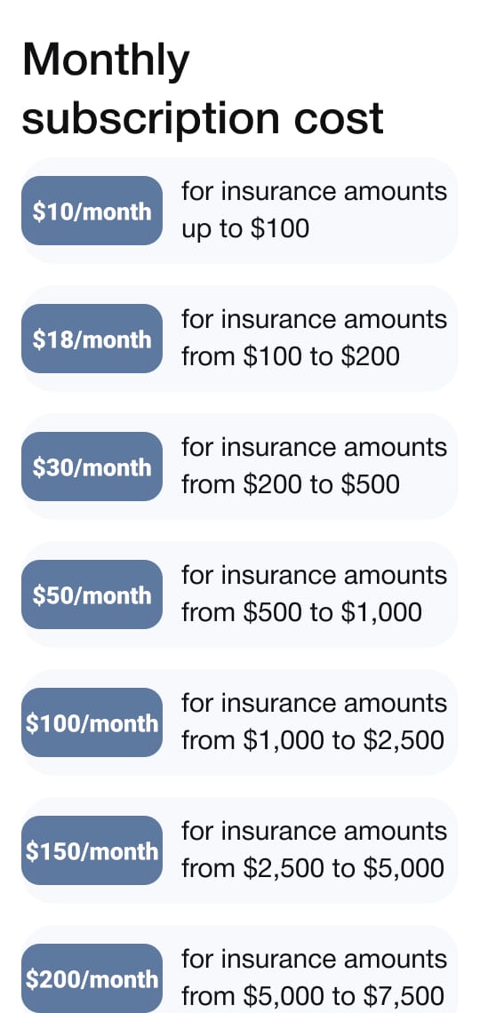 Participation is free for the first six months if the user subscribes within 24 hours. After six months, a subscription will cost from $10 to $200 depending on the insurance amount, or 2.5% for amounts over $7,500.