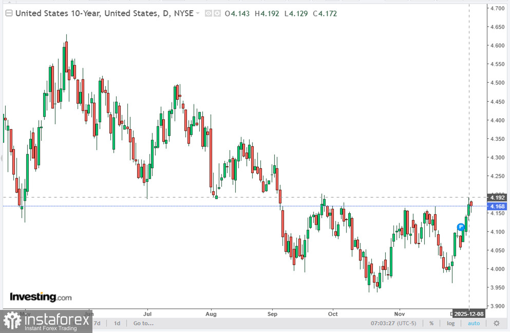 Доходность 10-летних казначейских облигаций, после тестирования верхней границы диапазона 3,95%-4,20%, сохраняющегося с сентября, немного снизилась во вторник. Хотя в понедельник она достигала 2,5-месячного максимума, общая тенденция к снижению доходности создает неблагоприятный фон для американской валюты.