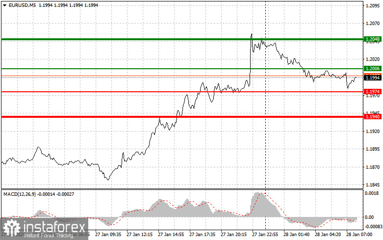 Сценарий №2: продавать евро сегодня также собираюсь в случае двух подряд тестов цены 1.2006 в момент, когда индикатор MACD будет находиться в области перекупленности. Это ограничит восходящий потенциал пары и приведет к обратному развороту рынка вниз. Можно ожидать снижения к противоположному уровню 1.1974 и 1.1940.