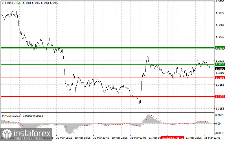 Тест цены 1.3193 пришелся на момент, когда индикатор MACD много прошел вниз от нулевой отметки, что ограничивало нисходящий потенциал пары. По этой причине я не продавал фунт.