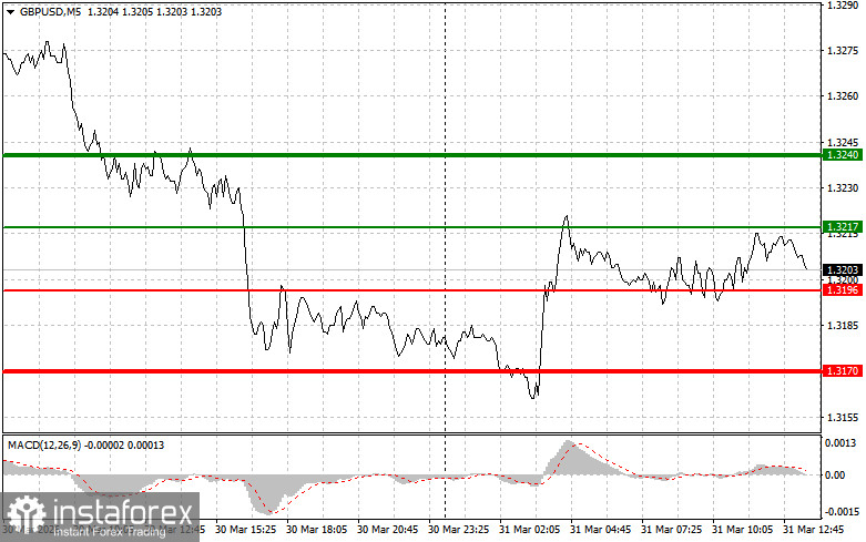 Сценарий №2: покупать фунт сегодня также планирую в случае двух подряд тестов цены 1.3196 в момент, когда индикатор MACD будет находиться в области перепроданности. Это ограничит нисходящий потенциал пары и приведет к обратному развороту рынка вверх. Можно ожидать рост к противоположным уровням 1.3217 и 1.3240.