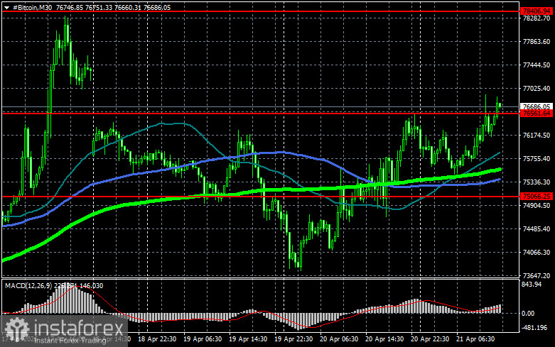 Что касается технической картины Bitcoin, то покупатели сейчас нацелены на возврат уровня $76 500, который открывает прямую дорогу на $78 400, а там уже и рукой подать до уровня 80 100. Самой дальней целью выступит максимум в районе $83 100, преодоление которого будет означать попытки возврата бычьего рынка. В случае падения биткоина покупателей жду на уровне $75 000. Возврат торгового инструмента под эту область может быстро свалить BTC в район $73 100. Самой дальней целью будет область $71 400.