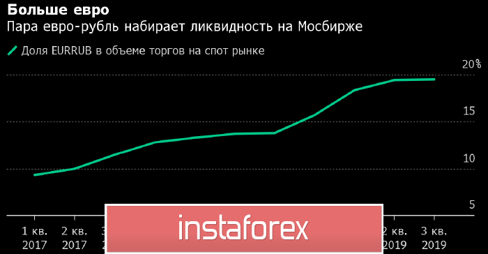 Согласно оценкам аналитиков, в сентябре 2019 года спрос на денежное средство еврозоны в 2,5 раза превысил спрос на доллар США. Специалисты полагают, что причинами этого стали дедолларизация и ввод отрицательных ставок по вкладам в евро в некоторых российских банках. Отметим, что дедолларизация российской экономики в первую очередь выражается в наращивании доли евро во внешней торговле РФ. Подобная ситуация способствует увеличению спроса на единую валюту со стороны российских компаний и частных лиц.