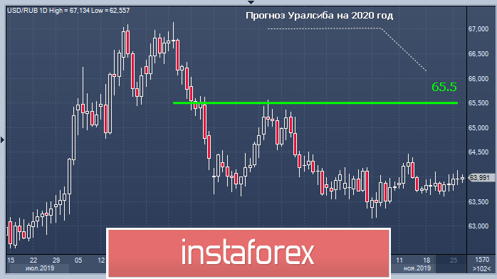 В начале следующего года многие аналитики не исключают роста курса рубля выше 65 руб. за 1 единицу американской валюты. Валютные стратеги крупнейшего банка Уралсиб считают, что в 2020 году средний курс российской валюты в паре USD/RUB достигнет 65,5 руб. за 1 доллар США. Напомним, в 2019 году курс составил 64,9 руб. за 1 доллар США. Негативными факторами для рубля станут возможное снижение ключевой ставки до 6% и падение нефтяных цен, подводят итог аналитики.