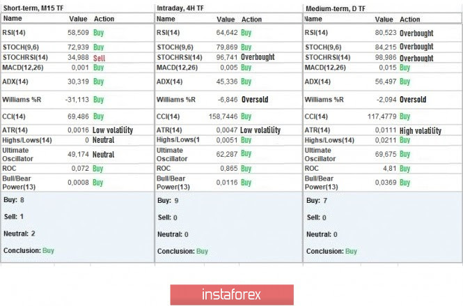 Analyzing the different sectors of time frames (TF), we can see that the indicators of technical instruments on the minute, hourly and daily periods signal "buy" due to the passing of quotes above the local high.