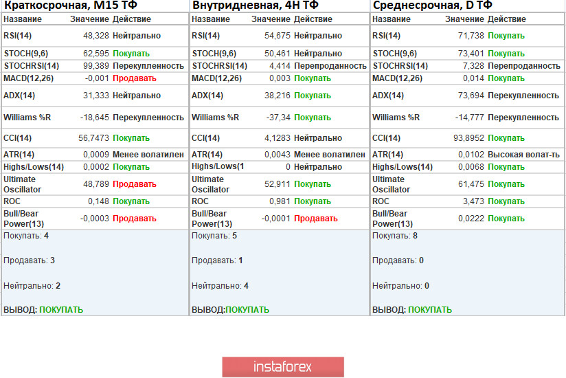 Анализируя разный сектор таймфреймов (ТФ), мы видим, что показатели технических инструментов на минутных, часовых и дневных периодах сигнализируют о покупке за счет колебания цены на условном максимуме.