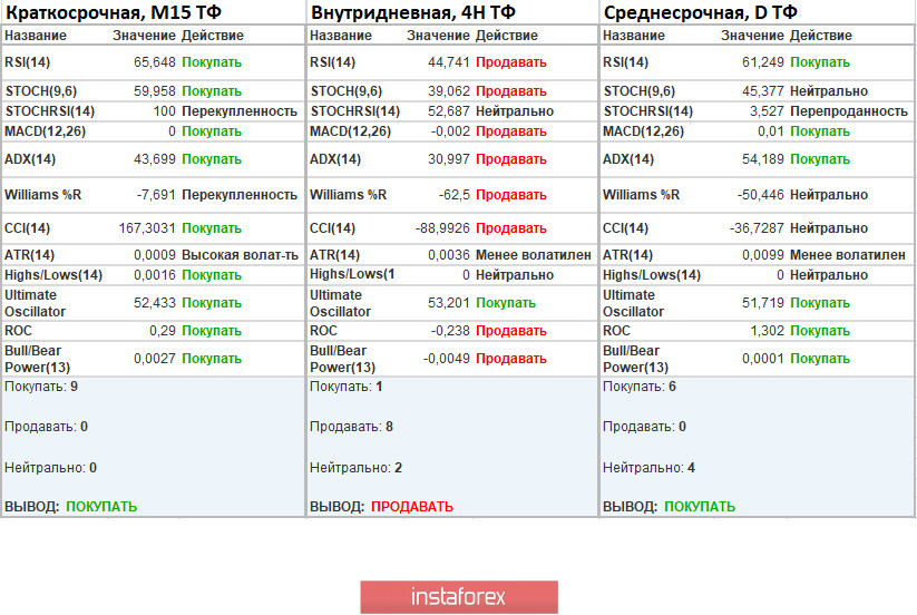 Анализируя разный сектор таймфреймов (ТФ), мы видим, что показатели технических инструментов на минутных интервалах сигнализируют о покупке за счет отскока цены от границы флета. Часовые периоды сигнализируют о продаже за счет нахождения цены ниже района 1,1800.
