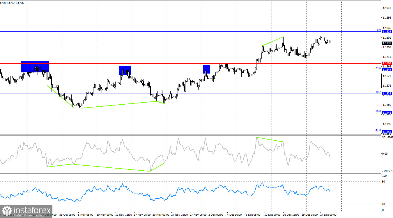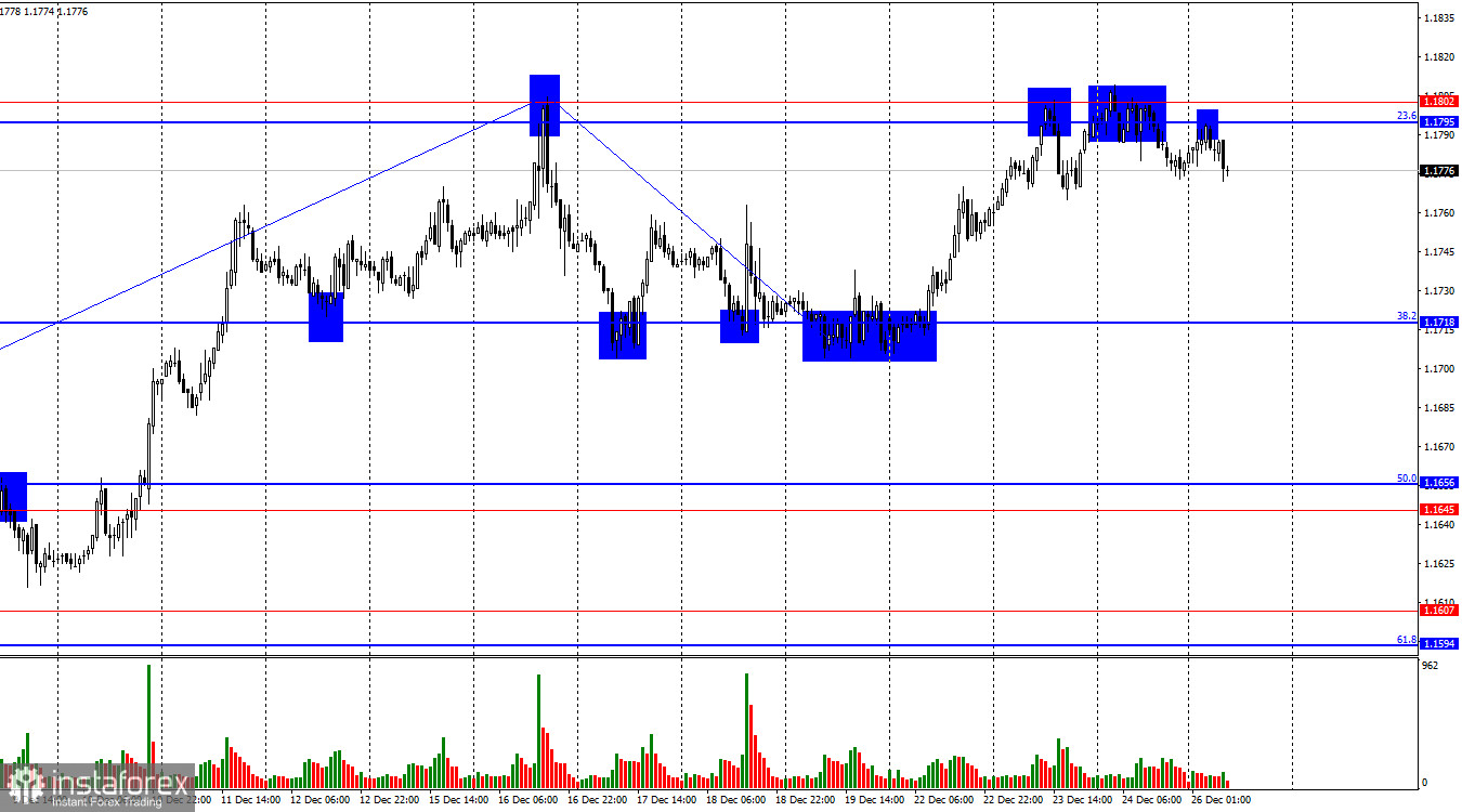 В среду информационный фон в США и Евросоюзе отсутствовал, а вся текущая неделя – больше праздничная, чем рабочая. Хочу напомнить, что текущий год начался с победы Дональда Трампа на выборах, что многие тут же начали связывать с будущим ослаблением американской валюты. Таким образом, для доллара 2025 год сразу не задался. Еще по ходу первого президентского срока Трамп неоднократно пытался добиться снижения курса американской валюты, так как видел в этом проблему низкого экспорта. Во второй срок Трамп не стал долго разглагольствовать по этому поводу и тут же приступил к делу. Безусловно, президент США инициировал торговую войну не для того, чтобы опустить курс американской валюты, но по итогу именно этого он и добился. Теперь США получают дополнительные поступления в бюджет от импортных тарифов, а помимо этого, курс доллара просел в течение года на 10-15% в зависимости от контрвалюты. Можно сказать, что в первый год президентства Трамп добился некоторых из своих целей. В следующем году он может продолжить работать над ними, поэтому я ожидаю еще большего падения доллара.