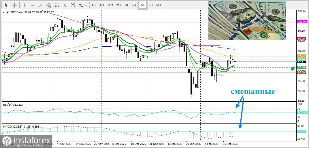 Тем не менее, индекс доллара показал устойчивость ниже уровня 97,30. И осцилляторы на дневном графике смешанные, при этом индекс относительной силы ещё не перешёл на отрицательную территорию, оставляя шанс быкам.