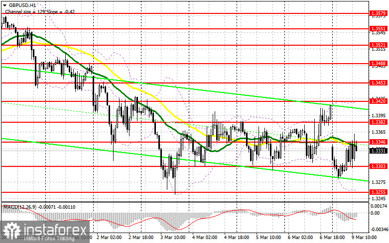 Отсутствие статистики по Великобритании теперь сменится аналогичным затишьем и с американской стороны. По этой причине весь акцент и дальше будет на военных ударах США и Израиля по Ирану и ответных мерах. Если вновь будет затронута энергетическая инфраструктура, то скорей всего фунт сильно просядет в паре с американским долларом. В таком случае первого проявления быков ожидаю в районе 1.3303, что даст точку входа в длинные позиции в расчете на восстановление к уровню 1.3346 – новому сопротивлению, образованному по итогам первой половины дня. Прорыв с обратным тестом сверху вниз этого диапазона приведут уже к новой точке входа в длинные позиции с перспективой выхода на 1.3382. Самой дальней целью окажется область 1.3420, где собираюсь фиксировать прибыль. При сценарии снижения GBP/USD и отсутствия активности со стороны быков на уровне 1.3303, давление на пару возрастёт, что приведет к новому крупному падению в район 1.3255. В таком случае лишь формирование там ложного пробоя будет подходящим условием на открытие длинных позиций. Покупать GBP/USD сразу на отскок собираюсь от поддержки 1.3215 с целью коррекции в 30-35 пунктов внутри дня.