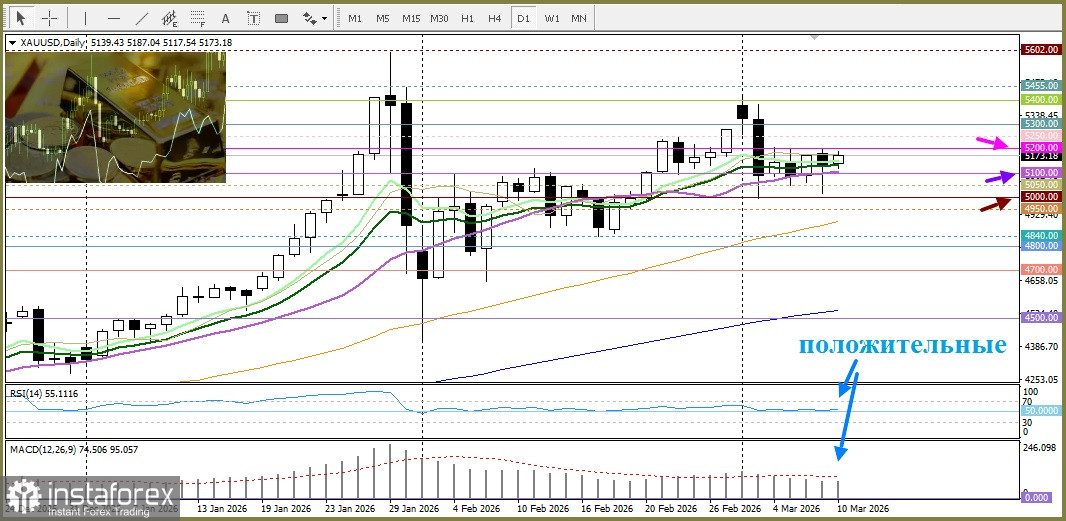 Смешанный новостной фон требует осторожности перед тем, как открывать агрессивные позиции на покупку золота, так как данных по инфляции в США, могут дать новый импульс. Индекс потребительских цен (CPI) выйдет в среду, а индекс потребительских расходов (PCE) - в пятницу, задав тон ожиданиям касаемо снижения ставки ФРС и спросу на доллар, что отразится на золоте. Но главный акцент остается на развитии американо-израильской войны с Ираном. А с технической точки зрения, сопротивлением выступает уровень $5200. Поддержкой $5100. Осцилляторы положительны, поэтому, у быков есть шанс прорваться выше. Если цены не удержат уровень $5100, то ускорят падение к психологическому уровню $5000.