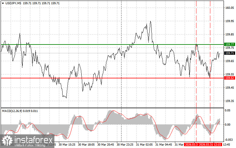 Сценарий №2: покупать USD/JPY сегодня также планирую в случае двух подряд тестов цены 159.63 в момент, когда индикатор MACD будет находиться в области перепроданности. Это ограничит нисходящий потенциал пары и приведет к обратному развороту рынка вверх. Можно ожидать рост к противоположным уровням 159.79 и 160.10.