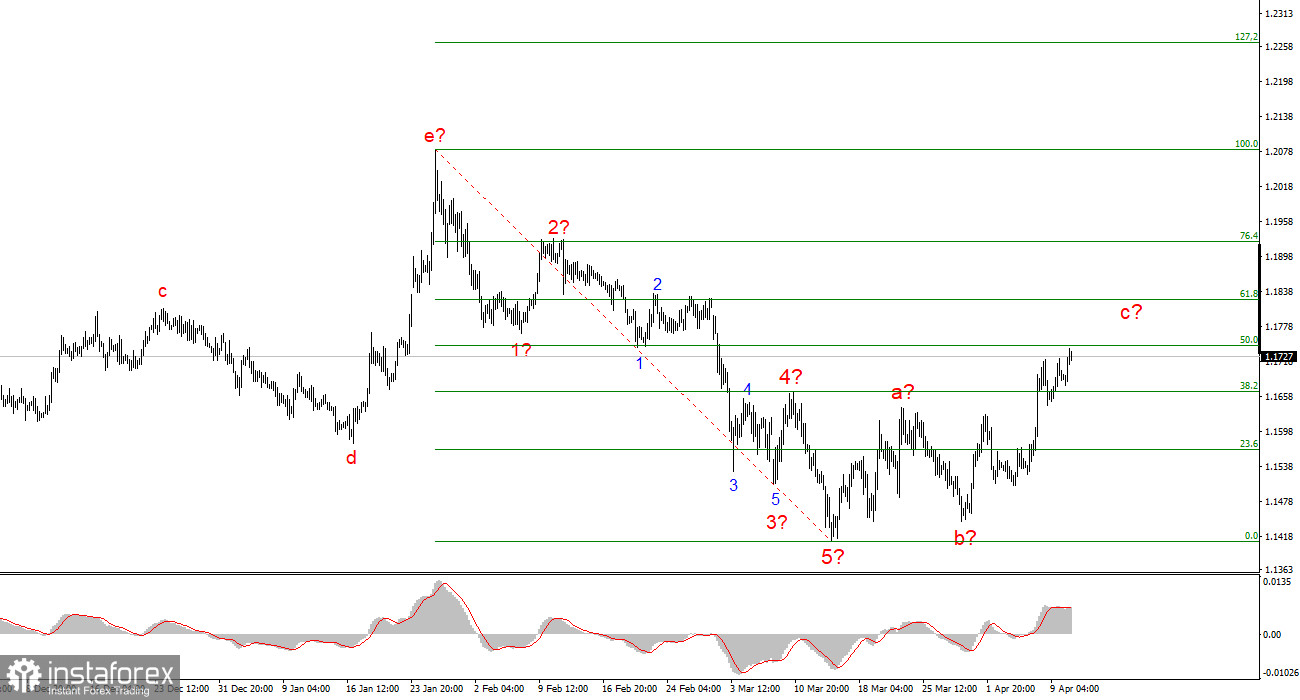 Курс инструмента EUR/USD в течение пятницы повысился на 25 базовых пунктов, сохранив недельную тенденцию. Напомню, что с самого начала недели рынок был настроен крайне скептически по поводу возможного перемирия между США и Ираном, а в среду днем американские журналисты даже предупреждали о возможном ядерном ударе по Ирану. Тем не менее, в начале недели инструмент EUR/USD немного поднялся, что можно трактовать, как обычную коррекцию. Ведь волновая разметка предполагала построение серии волн a-b-c.
