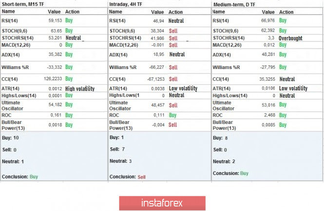 Analyzing the different sectors of time frames (TF), we can see that the indicators on the minute period signal "buy" due to a burst of long positions in the morning, while the indicators on the hourly period signal "sell" due to the consolidation of quotes near the price level of 1.3050. As for the daily period, the signal remains "buy" as before, mainly due to the general dynamics of the trend. However, if the quote consolidates below the price level of 1.29585, everything may change and turn downward.