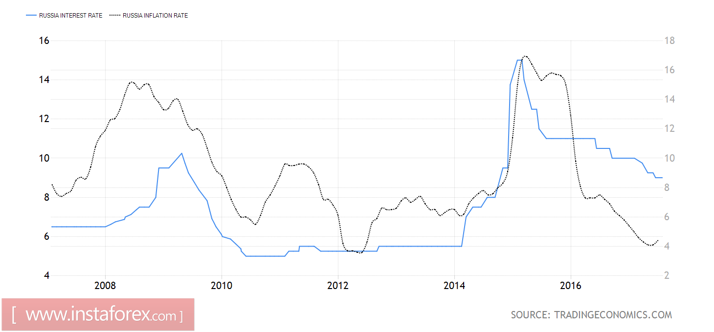 Если Федеральный резерв пугает угроза падения темпов роста PCE, то Центробанк РФ, напротив, ломает голову над ускорением инфляции. Судя по «голубиной» риторике его сопроводительного заявления, регулятор считает недавнее ускорение роста CPI – временным явлением. Тем не менее нужно понимать, что в данный процесс может вмешаться рубль. В России, имеющей печальный опыт гиперинфляции, рост котировок USD/RUB воспринимается как призыв к действию. Покупка иностранной валюты и товаров способна взвинтить инфляционные ожидания и цены, что усилит мигрени Банка России.