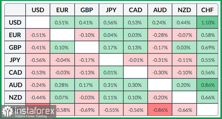 В таблице ниже показано процентное изменение доллара США по отношению к основным валютам сегодня. Доллар США был сильнее по отношению к швейцарскому франку.