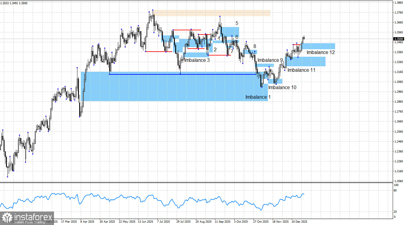 Пара GBP/USD выполнила отбой от «бычьего» имбаланса 11 и возобновила процесс роста, как я и предполагал. Реакция на «бычий» имбаланс 11 оказалась уже второй, первый один сигнал на покупку был получен еще на прошлой неделе. На данный момент сделки на покупку находятся в прибыли уже около 400 пипсов по самым скромным подсчетам, и трейдеры могут сами решать, что делать с ними дальше. Рынок закрыт в четверг, возобновит он свою работу только в пятницу утром. Однако и в пятницу мы вряд ли увидим высокую активность трейдеров. Информационный фон будет отсутствовать, а желание торговать в день, «оторванный» от других дней, вряд ли возникнет у трейдеров. На мой взгляд, процесс роста британца будет продолжен. Отмечу, что на этой неделе был образован новый «бычий» имбаланс 12, который в будущем может послужить поводом для открытия новых сделок на покупку для тех трейдеров, кто не сделал этого раньше. И если британец получит реакцию на этот паттерн, это будет уже четвертый по счету «бычий» сигнал.