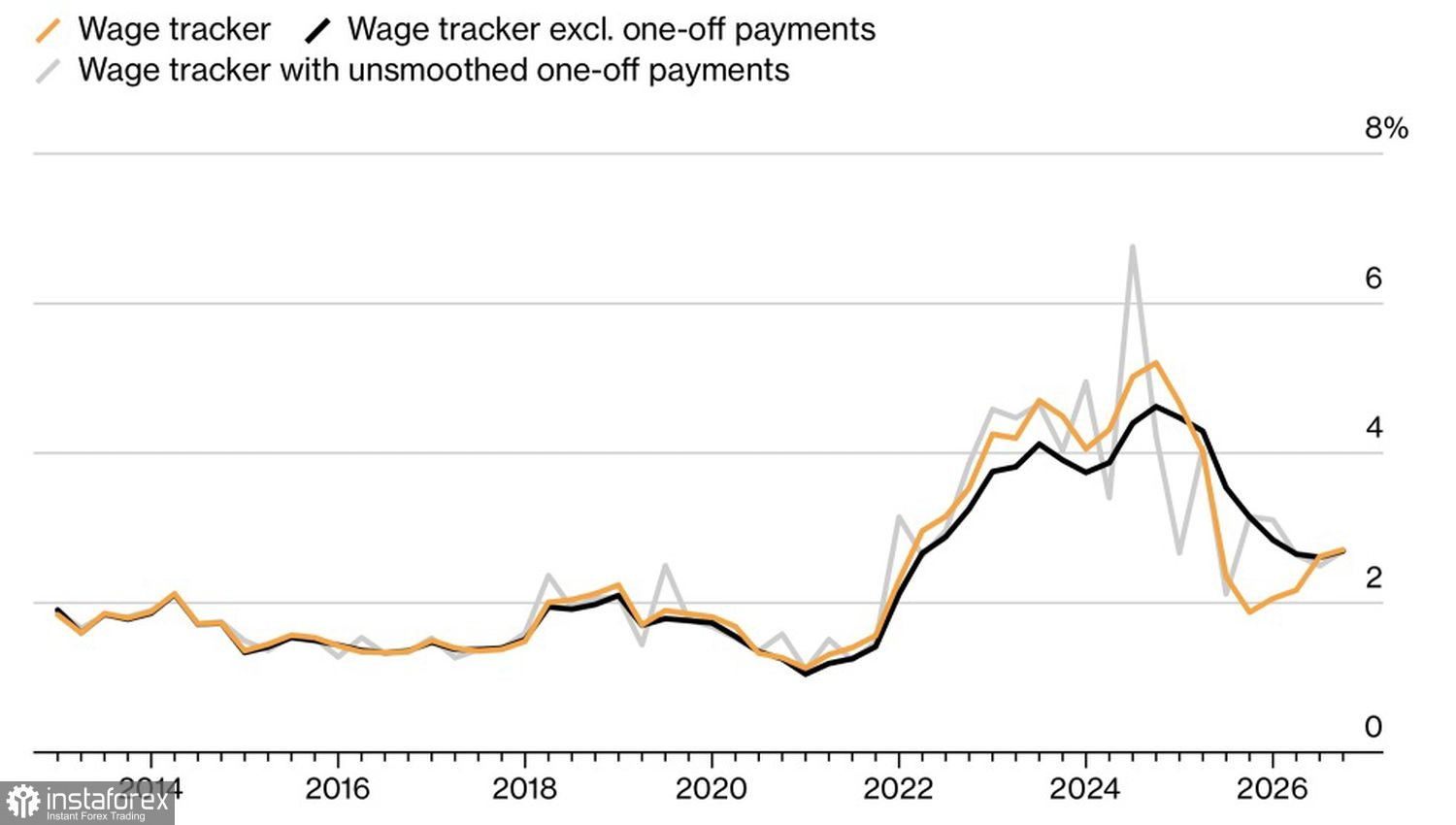 В качестве основной причины выступают оптимистичные оценки европейских зарплат. ЕЦБ прогнозирует, что в третьем квартале они вырастут на 2,6%, в четвертом – на 2,7%. Пусть эти цифры далеки от имевших место в 2024 5% и выше, однако времена изменились. Для возвращения инфляции в таргету достаточно подобной динамики оплаты труда.