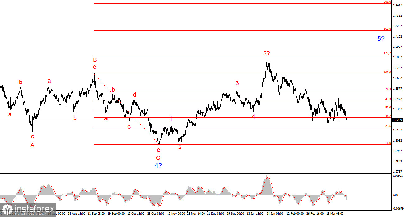 По инструменту GBP/USD волновая разметка продолжает свидетельствовать о построении повышательного участка тренда(нижняя картинка), но в более краткосрочном плане началось построение сложной и протяженной коррекционной структуры, которая может стать самостоятельным трендом. Безусловно, без войны в Иране и стремительного роста цен на энергоносители понижательный набор волн ограничился бы стандартными тремя. Однако этот тот случай, когда новостной фон привел к существенному видоизменению волновой разметки. Волновая разметка не может влиять на новостной фон, не может его заблокировать. Новостной фон может влиять на волновую разметку.